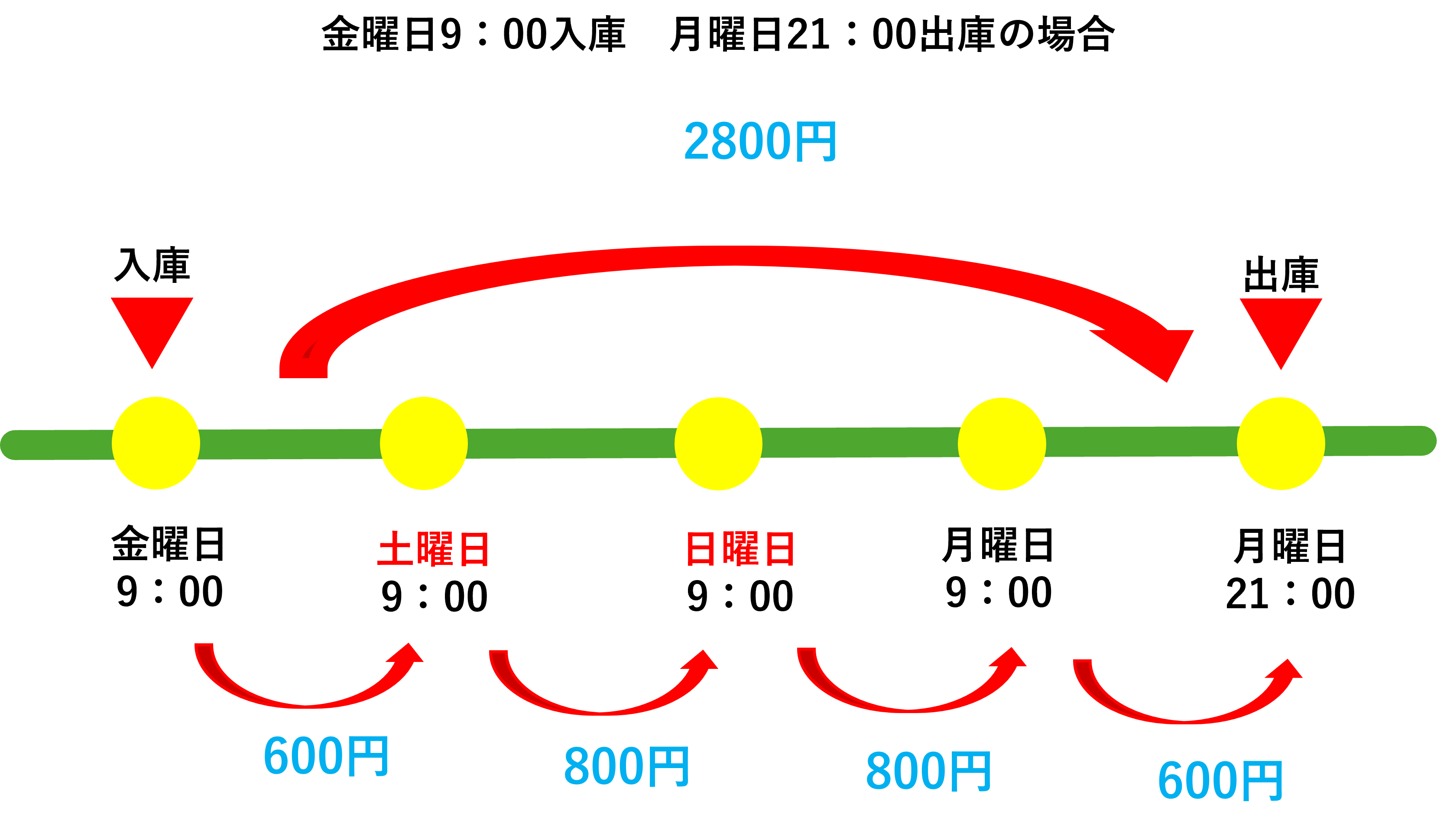 平日は入庫から24時間ごとに600円、土日祝は入庫から24時間ごとに800円となります。